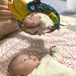 一部に小さな鏡がある遊具とちがい赤ちゃんの顔全体が入る大きさで、ママと一緒にのぞきこんだり、「これなんだろう?」と好奇心から鏡に映る自分の顔に手を伸ばしたり。鏡遊びがたくさん楽しめます。