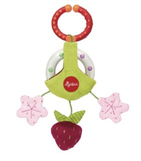 触るとパリパリする音がするお花、ふっくらやわらかい布素材のいちごや凸凹があり感触を楽しむプラ素材のリングが、赤ちゃんの好奇心を刺激します。