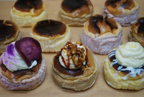 ★紅芋バスクチーズケーキ…宮古島産ちゅら恋紅のペーストを使用し、トッピングに紅芋チップスで色鮮やかに。