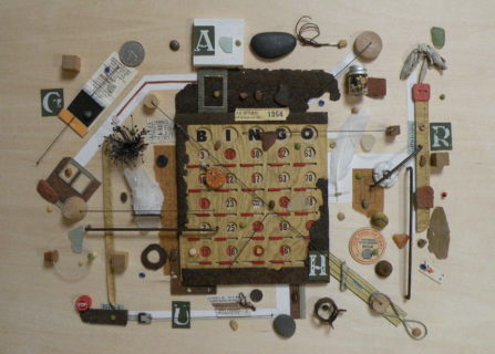 街中で集めた古びた木片、さびた金属、壊れた部品などを集めて、