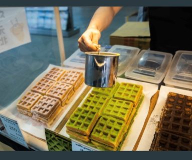 シュー生地ベースで、メープル風味のふわふわモチモチ食感が特徴のフレンチスタイルワッフルです。