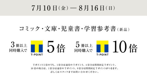 新品販売の、コミック・文庫・児童書・学習参考書、3冊以上でTポイント5倍、5冊以上でTポイント10倍キャンペーンを実施しております。