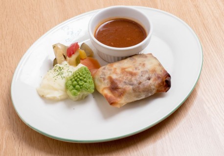 ハンバーグ、ベーコン、チーズを春巻きの皮で包み、焼き上げたました。