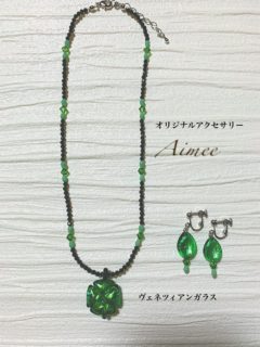 ヴェネツィアンガラス、スワロフスキー、チェコガラス、天然石などを使用したアクセサリーが多数。