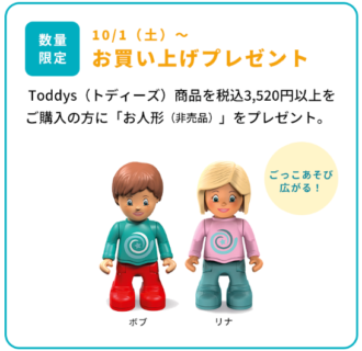 Toddys(トディーズ)商品を税込3,520円以上をお買い上げのお客様に「お人形」(いずれか1種)をプレゼント!