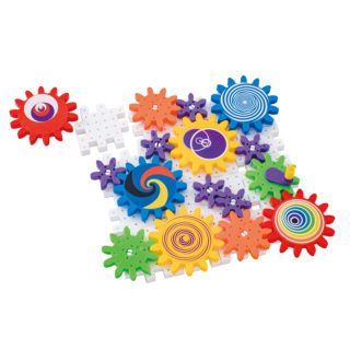 歯車パーツを組み合わせうまく嚙み合うと、連動して一気に回り出すしかけ。